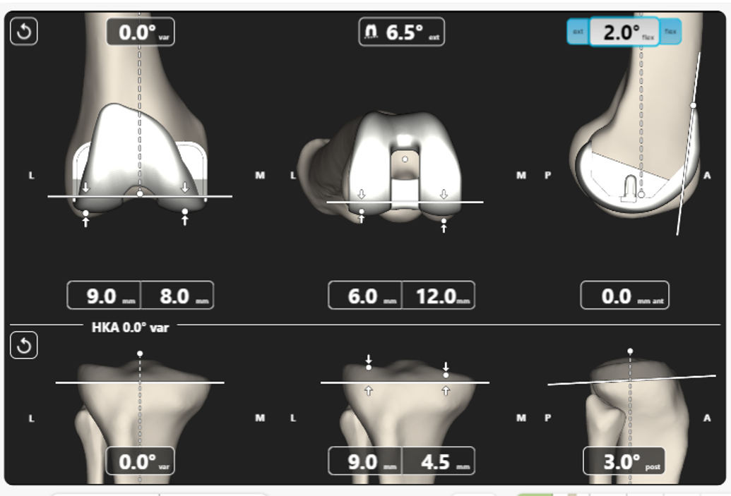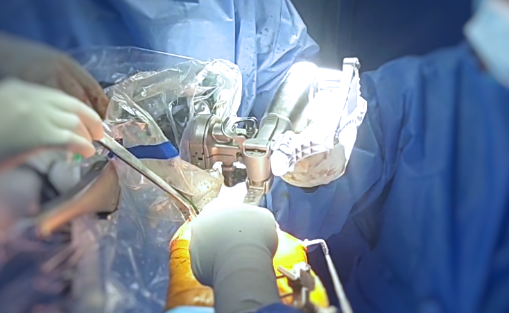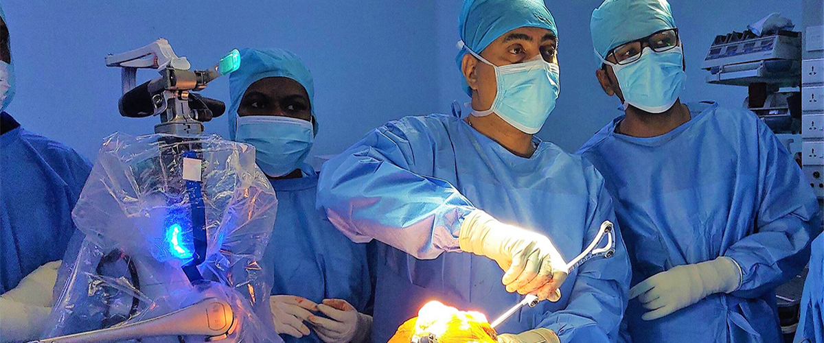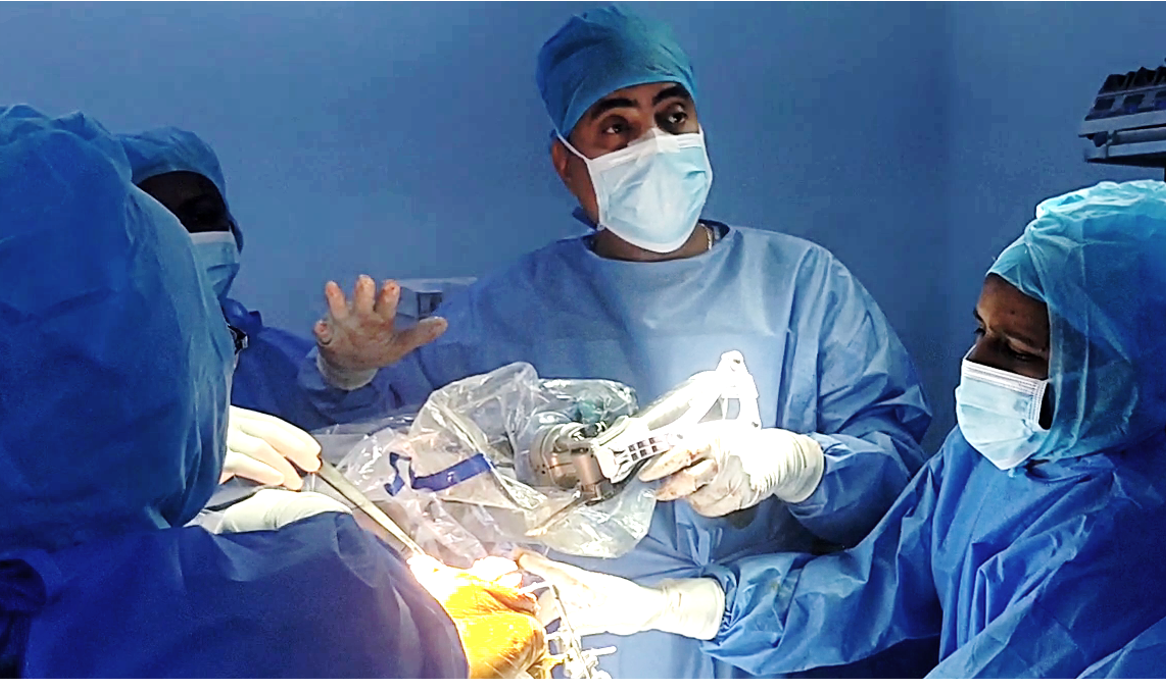 During knee replacement surgeries, the damaged bone and cartilage is removed from the joint before an artificial joint is implanted. Using a robot provides the surgeon with data about the knee joint, which helps the surgeon to know how to position the implant based on patient’s unique anatomy.